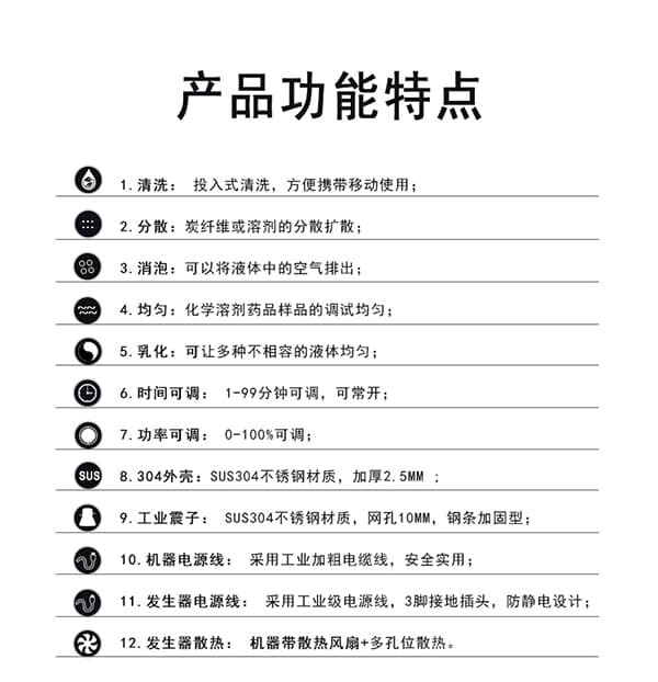 实验室高校研究所应用:碳纤维分散扩散,化学溶液的搅拌、均匀、加速反应,细胞粉碎,产品粉碎,物质分散(悬浮液制备)和凝聚;
